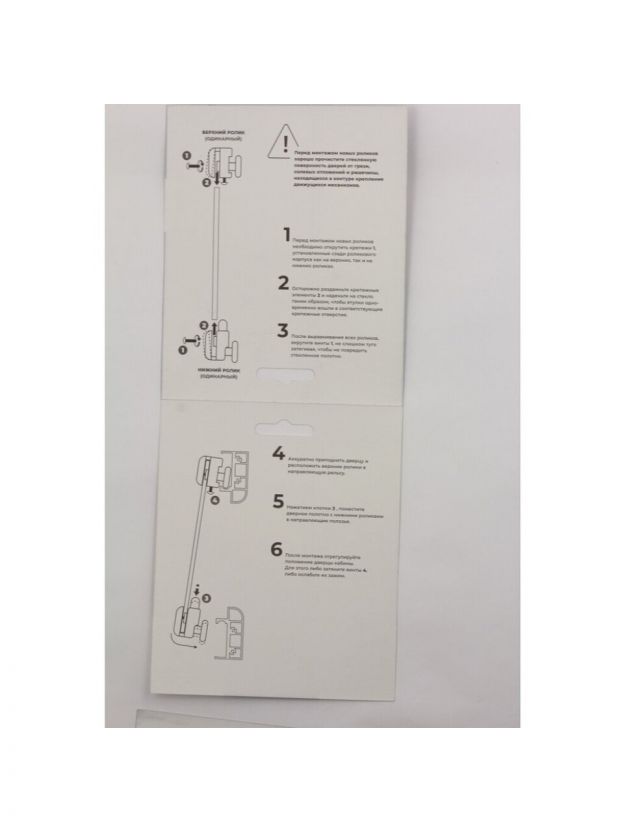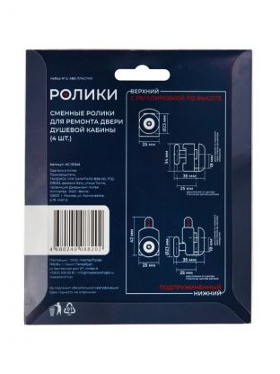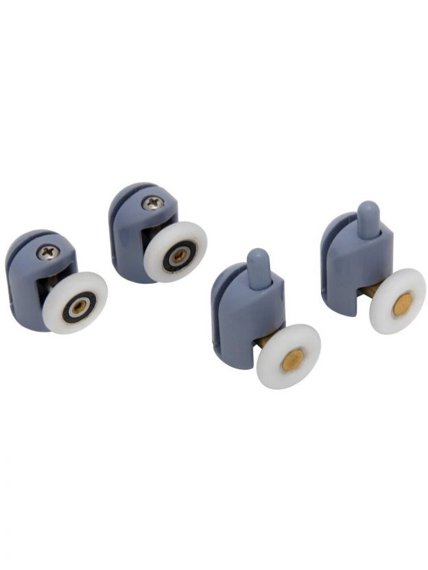 Комплект сменных натяжных роликов для душевой кабины: два одинарных подвесных (верхних) ролика с регулировочным винтом по высоте и два одинарных подпружиненных нижних ролика.