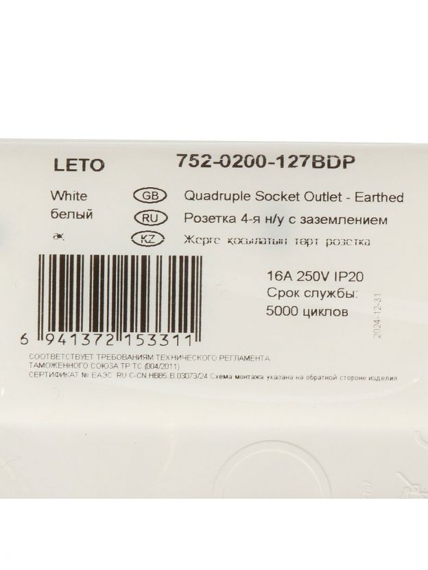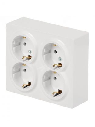 Розетка открытой установки, 4 гнезда, с заземлением, 16 А, 220 В, пластик, IP20, белая, закрытый корпус, Lezard, Leto, 752-0200-127BDP