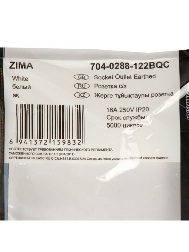 Розетка скрытой установки, 1 гнездо, с заземлением, 16 А, 250 В, пластик, IP20, белая, безвинтовой, зажим/клемма, Lezard, Zima, 704-0288-122BQC