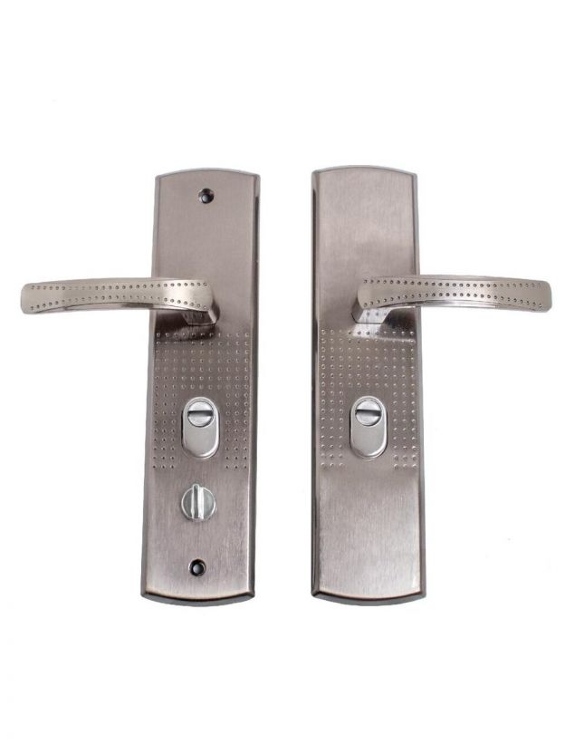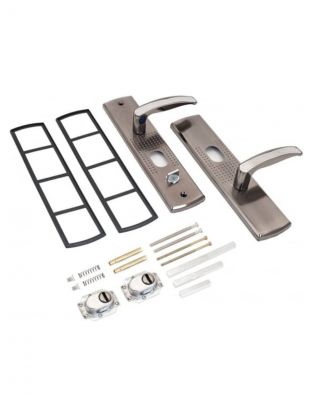 Ручка на планке под цилиндровый механизм. Предназначены для китайских металлических дверей. Подходят для замков автоматического и не автоматического закрывания. Характеристики: материал: сталь, гальваническое покрытие; межосевое расстояние: 68 мм; размеры планки: 70х275 мм; длина/высота ручки: 120/21 мм; цвет ручек и планки: никель; cторона открывания двери: правая. В комплект входят две ручки, винтовые стяжки, пластиковые прокладки и квадратный штырь (8х8 мм) 110 мм, комплекты стержней для автоматических и не автоматических замков. На наружней ручке имеется подсветка замочной скважины.