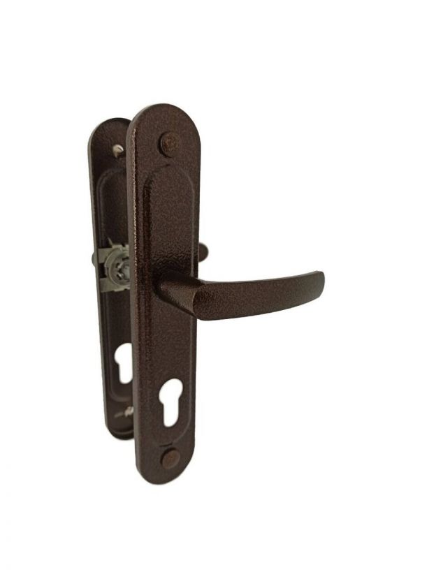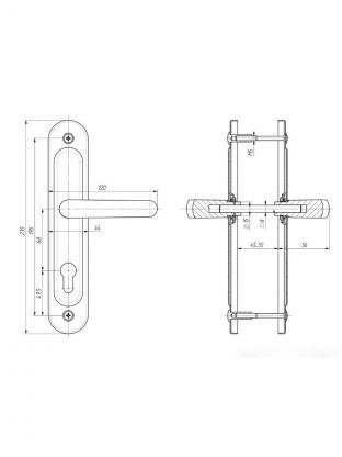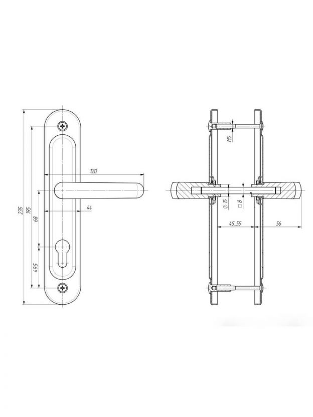Ручка на планке под цилиндровый механизм. Предназначена для китайских металлических дверей, подходят для замков не автоматического закрывания. Толщина полотна: 45-55 мм Материал планки: Сталь, толщиной 1 мм Межосевое расстояние: 68 мм, размеры планки - 44х235 мм, длина/высота ручки - 45/108 мм соответственно. В комплект входят две ручки, винтовые стяжки, квадрат 8х8 х 110 мм. Дополнительная информация: Ручка универсальная.