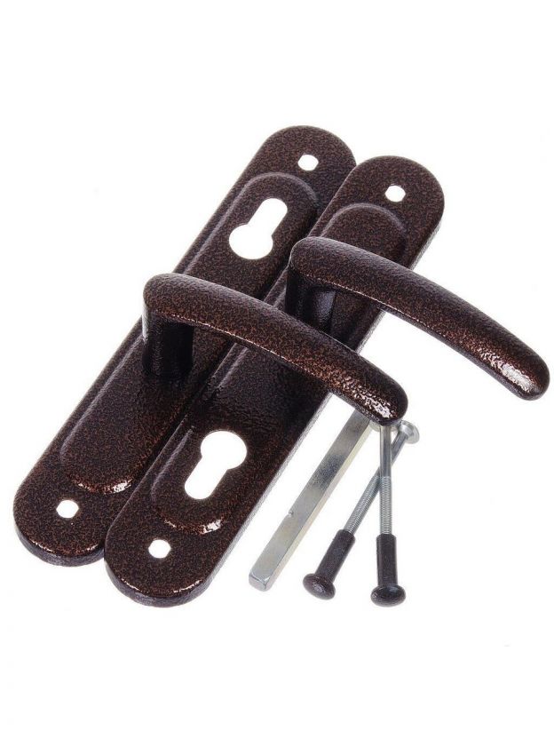 Ручка на планке под цилиндровый механизм. Предназначена для китайских металлических дверей, подходят для замков не автоматического закрывания. Толщина полотна: 45-55 мм Материал планки: Сталь, толщиной 1 мм Межосевое расстояние: 68 мм, размеры планки - 44х235 мм, длина/высота ручки - 45/108 мм соответственно. В комплект входят две ручки, винтовые стяжки, квадрат 8х8 х 110 мм. Расстояние между крепежными отверстиями: 18.7 см.