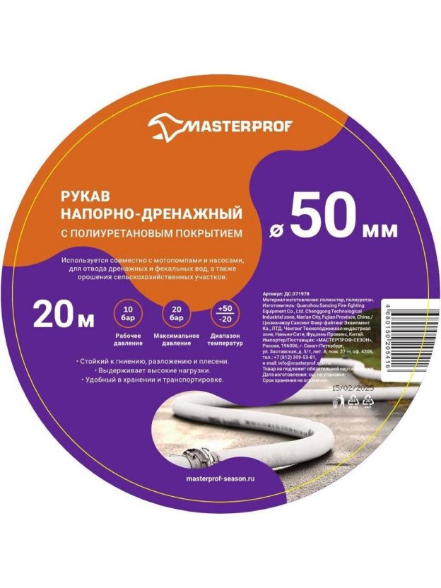 Шланг напорно-дренажный, d50 мм, MasterProf, 20 м — надежное решение для эффективного водоснабжения и отвода воды на участке, в саду или на даче. Благодаря прочной конструкции и оптимальному диаметру 50 мм, шланг обеспечивает высокую пропускную способность и устойчивость к внешним воздействиям. Длина 20 метров позволяет использовать его для полива больших территорий, организации систем орошения, а также для откачки воды из бассейнов, прудов и других резервуаров. Продукт сочетает в себе практичность, долговечность и удобство эксплуатации, что делает его востребованным среди владельцев частных домов, дач и загородных участков.