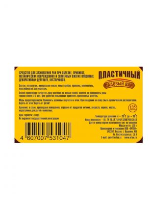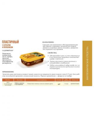 В упаковке 135 г пластичного садового вара. Этого объёма достаточно для обработки 10–15 средних срезов на плодовых деревьях или кустарниках. Контейнер плотно закрывается, предотвращая высыхание.