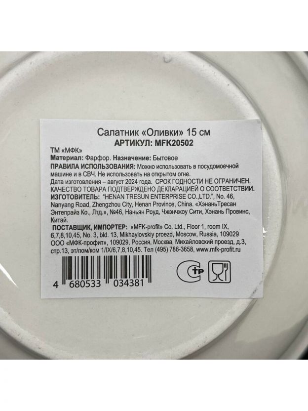 Диаметр — 15 см, высота — 5 см; форма — круглая, материал — фарфор, модель — «Оливки» от МФК.