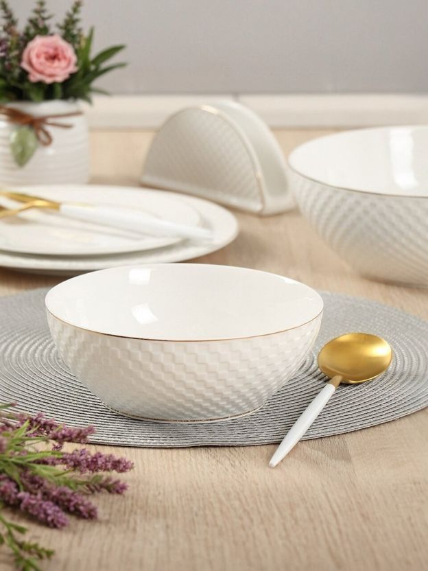 Салатник Daniks Кембридж — это удачный выбор для тех, кто ищет, какой салатник купить недорого для дачи или дома, не жертвуя стилем. Керамика сохраняет свежесть продуктов, а рельефный узор с золотой окантовкой делает подачу блюд по-настоящему праздничной. В отличие от пластиковых и стеклянных аналогов, керамика не впитывает запахи и устойчива к царапинам, что особенно важно для ежедневного использования.
