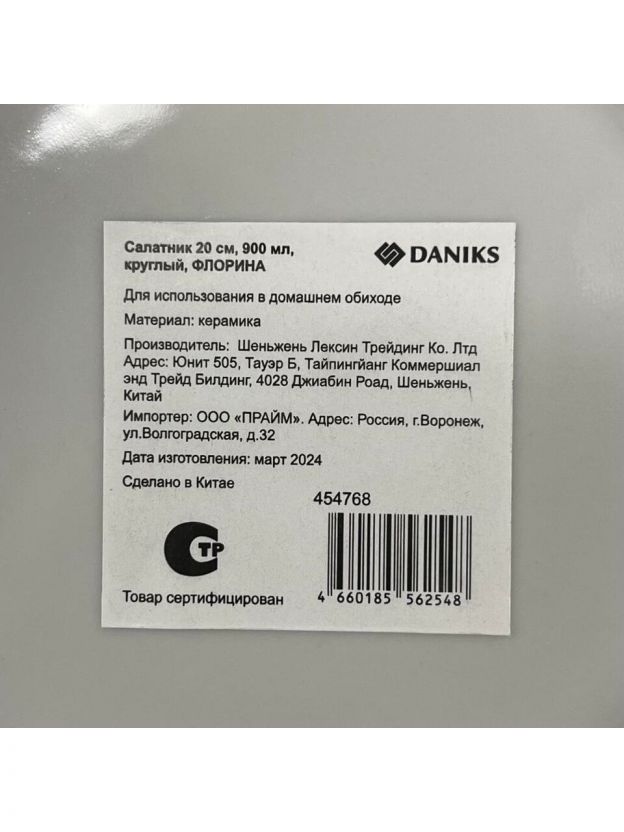 Какой объём и размер салатника Daniks Флорина?