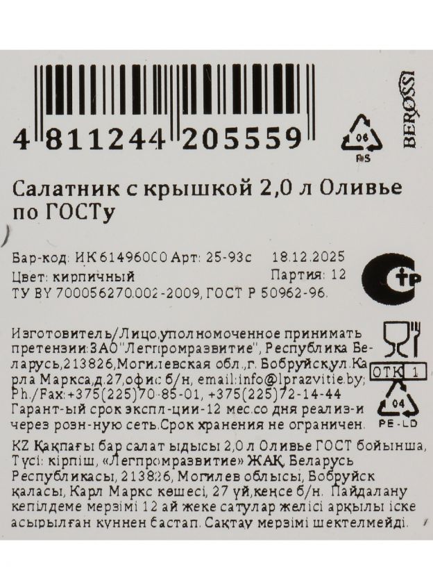 Какой объём и размер у салатника Berossi «Оливье по ГОСТу»?