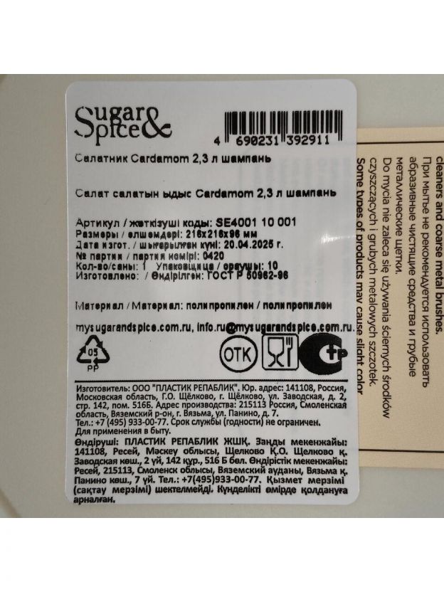 Да, пластиковый салатник Sugar&Spice Cardamom подходит для мытья в посудомоечной машине — материал не теряет форму и цвет даже при частом использовании.