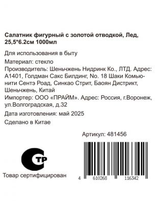 Салатник предназначен для холодных и тёплых закусок. Не рекомендуется использовать в СВЧ и посудомоечной машине — это продлит срок службы золотой отводки.