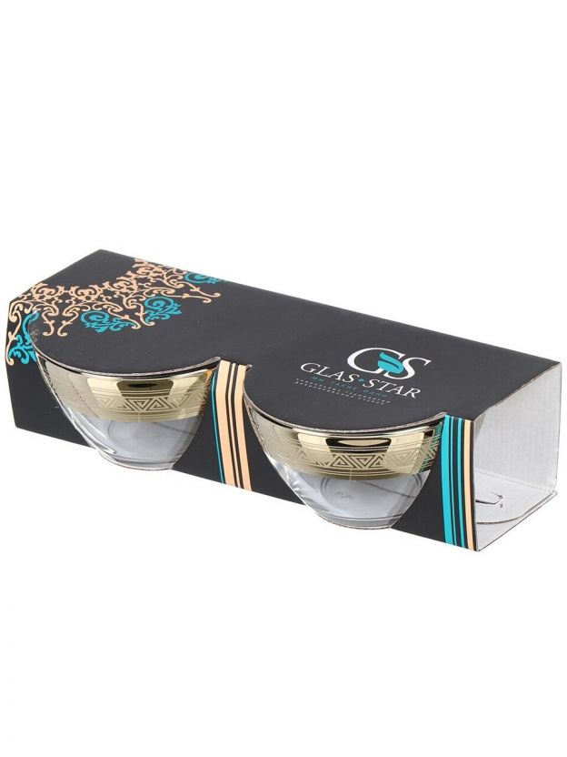 Салатники Glasstar «Магия» — набор из 2 стеклянных чаш, 6x6 см, с золотой окантовкой и абстрактным рисунком. Элегантное решение для сервировки и подарка.