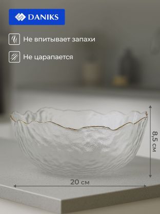 Часто спрашивают: «Как выбрать салатник для сервировки?» или «Чем отличается стеклянная чаша от керамической?» — ответ прост: стеклянная посуда визуально облегчает подачу, не впитывает запахи, легко очищается, а золотая окантовка придает праздничный вид. В отличие от аналогов, этот салатник Daniks не подходит для СВЧ и посудомоечной машины, что важно учесть при выборе. Если вы ищете, какой салатник купить недорого для дачи или подарка, обратите внимание на этот вариант — он сочетает презентабельность и доступность.