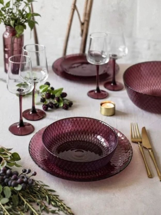 - Уникальный дизайн с рельефным узором и лиловым оттенком — современный акцент на вашем столе