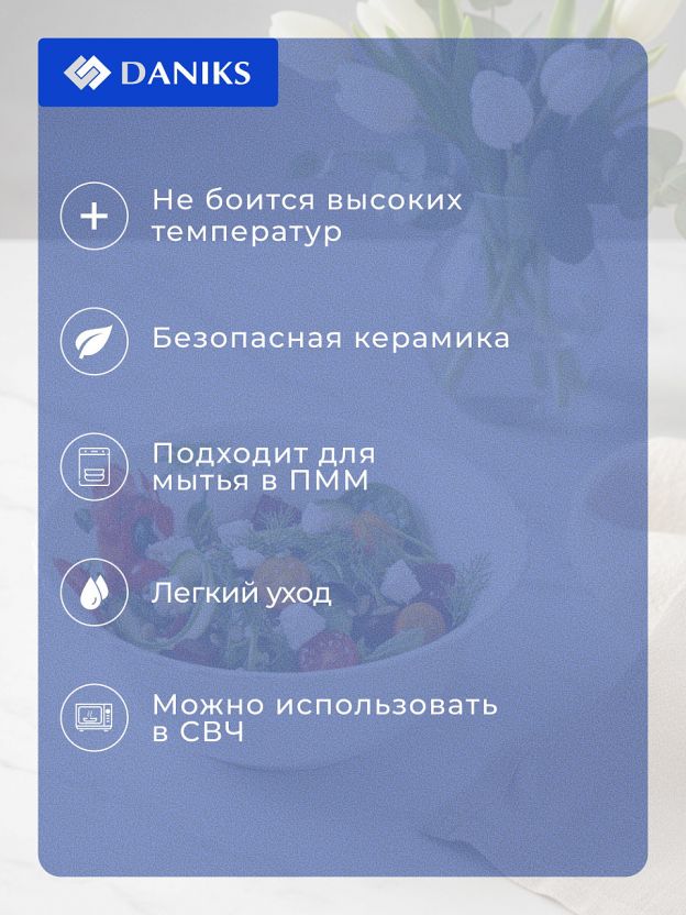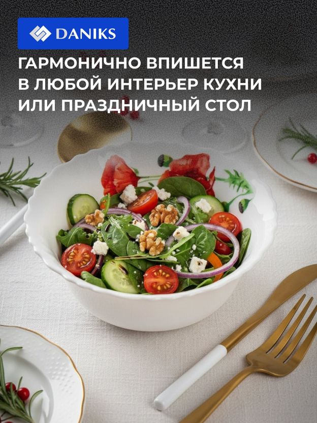 Чем отличается этот салатник от других? В отличие от обычных стеклянных мисок, изделие Daniks выделяется оригинальным цветочным декором и возможностью безопасного использования в СВЧ и посудомоечной машине, что важно для современных кухонь.