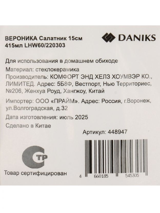 Салатник из стеклокерамики Daniks Вероника — стильный выбор для сервировки: прочный, лёгкий, подходит для СВЧ и посудомоечной машины. Размер 15x5 см, объём 415 мл.