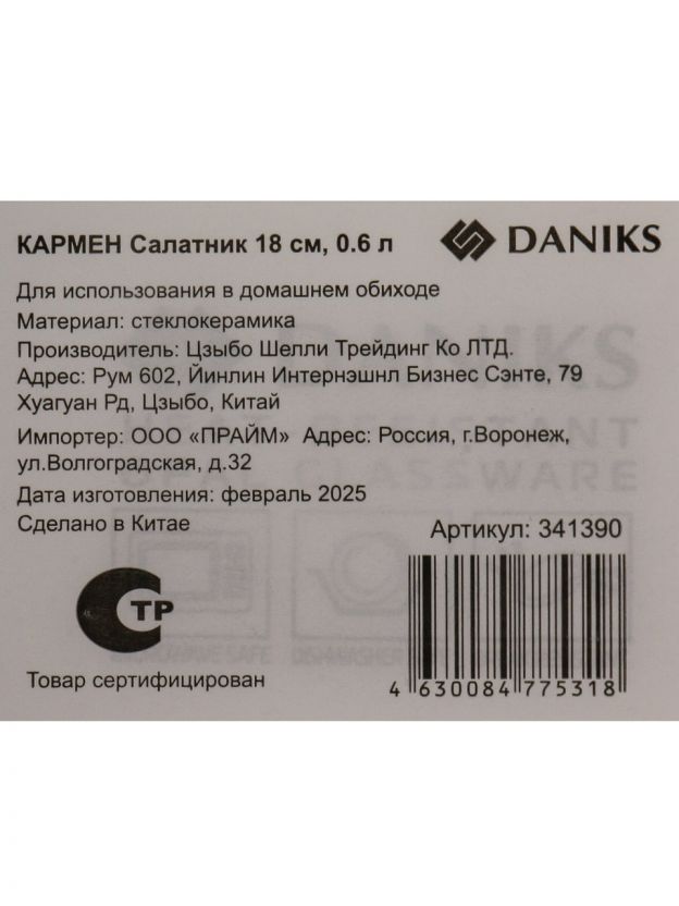 Салатник из стеклокерамики Daniks Кармен 0.6 л — стильное и прочное решение для сервировки, подходит для микроволновки и посудомоечной машины.