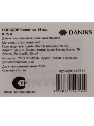 Салатник Daniks Вэнсдей 0.75 л — стильное решение для сервировки и хранения: прочная стеклокерамика, современный дизайн, подходит для СВЧ и посудомоечной машины.