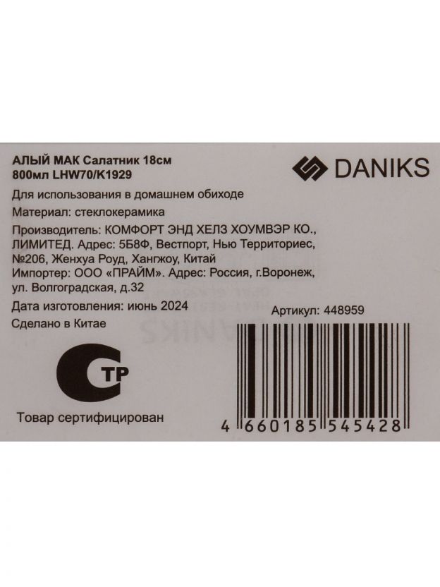 Салатник из стеклокерамики Daniks «Алый мак», 0.8 л — стильное решение для сервировки, подходит для СВЧ и посудомоечной машины, выгодная цена.