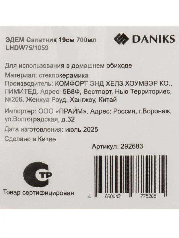 Салатник Daniks Эдем 0.7 л: стиль прованс, прочная стеклокерамика, оптимальный размер 19 см — решение для сервировки и хранения без лишних хлопот.