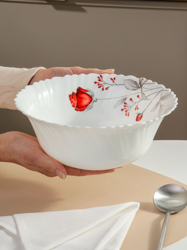 Диаметр салатника — 23 см, высота — 9 см, объём — 2 литра. Это оптимальный размер для подачи салатов, закусок и горячих блюд.