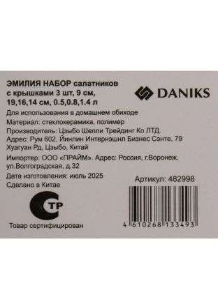 Салатники Daniks Эмилия: набор из 3 стеклокерамических мисок с крышками (0.5/0.8/1.4 л) — идеальное решение для сервировки, хранения и подачи свежих салатов дома и на даче.
