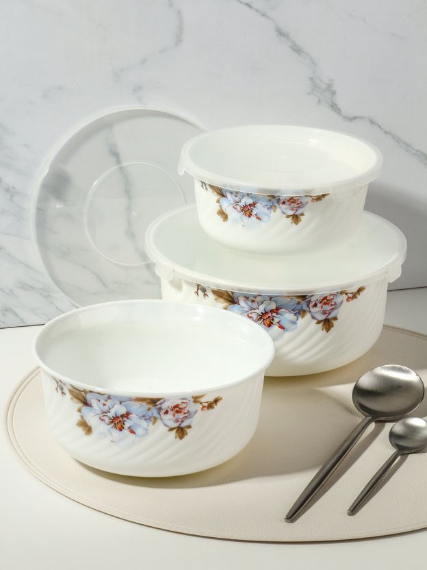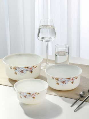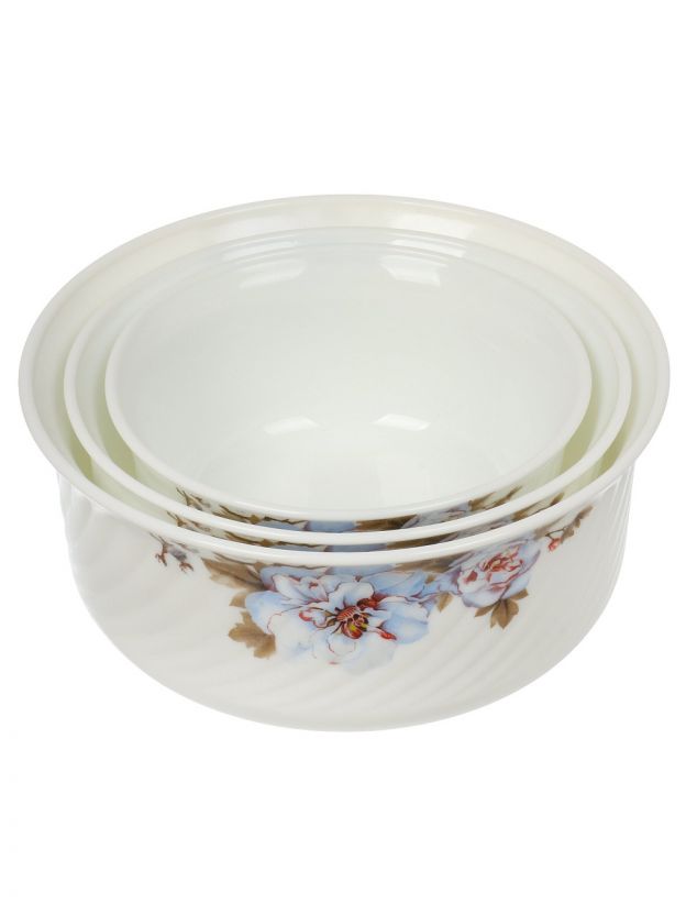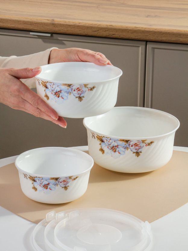 - Три салатника разного объёма (0.5, 0.8, 1.4 л) из прочной стеклокерамики — подходят для СВЧ и посудомоечной машины