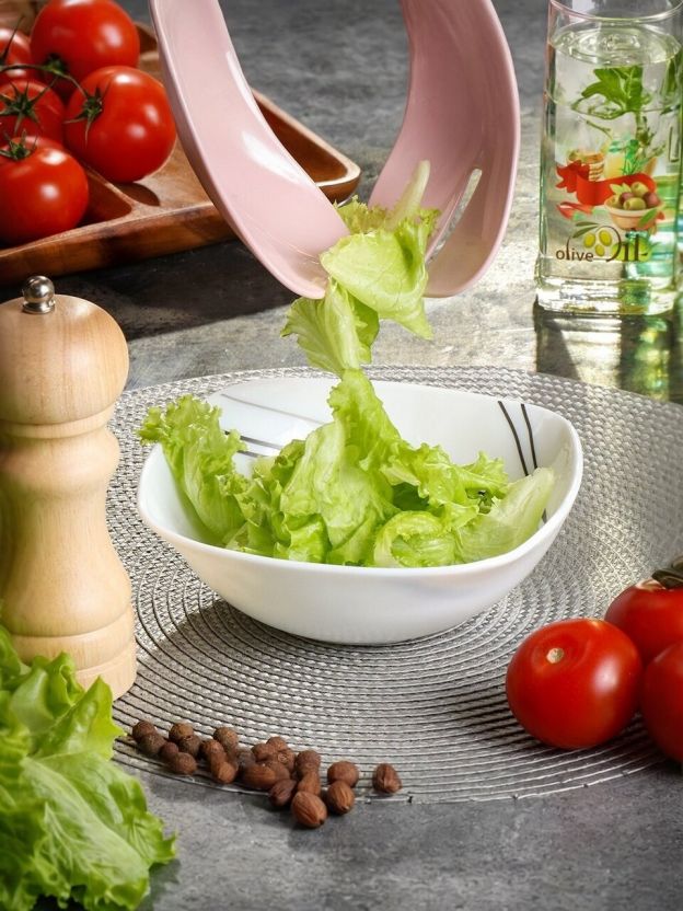 Размер салатника — 14х5 см, объём — 0,4 литра, вес — 0,2 кг. Оптимально для порционных салатов, закусок и фруктов.