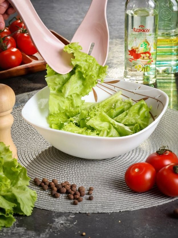 - Оптимальный объём и форма: квадратный салатник 20 см, 1.2 л из прочной стеклокерамики — долговечность и безопасность