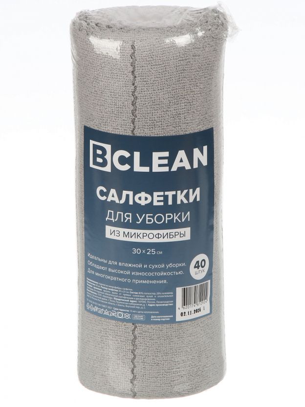 Салфетка бытовая для уборки, микрофибра, 30х25 см, 40 шт, Bclean, в рулоне, 81292