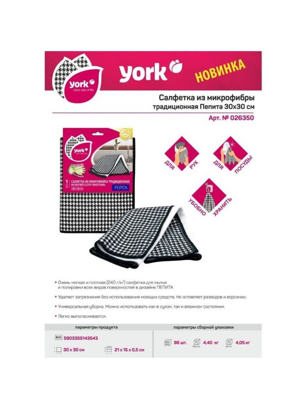Салфетка бытовая для уборки, микрофибра, 30х30 см, York, 026350