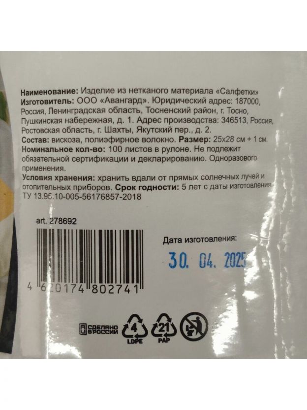 Салфетка бытовая для уборки, вискоза, 25х28 см, 100 шт, Марья Искусница, 80274
