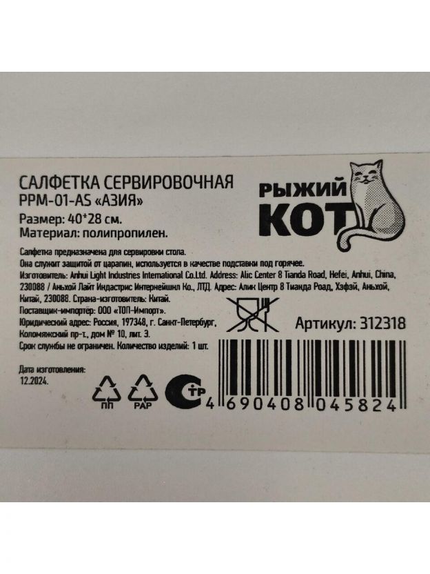 Салфетка для стола пластик, 40х28 см, прямоугольная, Азия, PPM-01-AS/ 312318