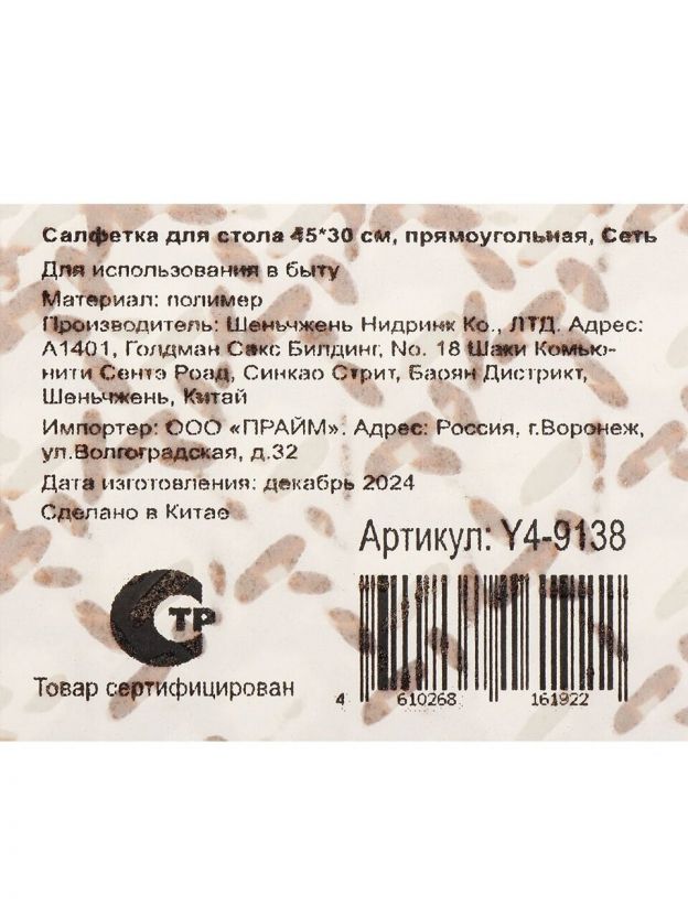 Салфетка для стола полимер, 45х30 см, прямоугольная, коричневая, Сеть, Y4-9138