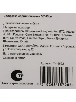 Салфетка сервировочная 30*45 см Y4-9622 — популярный выбор для тех, кто ищет, какую салфетку для сервировки купить недорого для дачи или дома. Благодаря универсальному размеру и устойчивости к загрязнениям, она отлично защищает стол от пятен, царапин, влаги. Часто спрашивают: «подходит ли такая салфетка для ежедневного использования?» — да, её легко мыть, она быстро сохнет, не теряет форму и цвет.