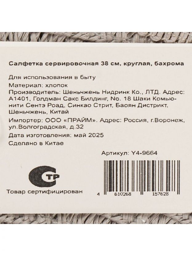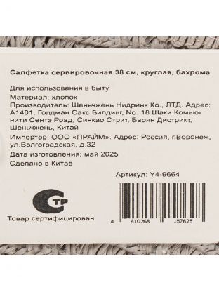 Салфетка сервировочная полимер, 38 см, круглая, бахрома, Y4-9664 — стильное решение для сервировки стола. Оригинальный дизайн с бахромой подчеркнет индивидуальность интерьера и добавит уюта. Практичный материал легко очищается и сохраняет привлекательный вид. Идеальный выбор для кухни, гостиной, дачи.