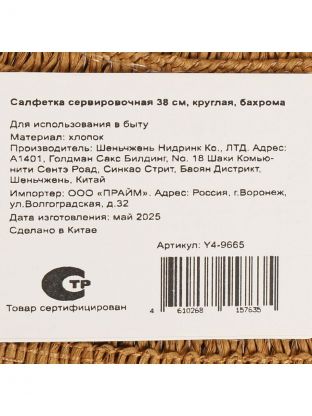 Салфетка сервировочная полимерная круглая диаметром 38 см с бахромой Y4-9665 — стильное решение для оформления праздничного и повседневного стола. Современный дизайн, прочный материал и оригинальная бахрома подчеркнут индивидуальность интерьера и создадут атмосферу уюта. Преимущества: