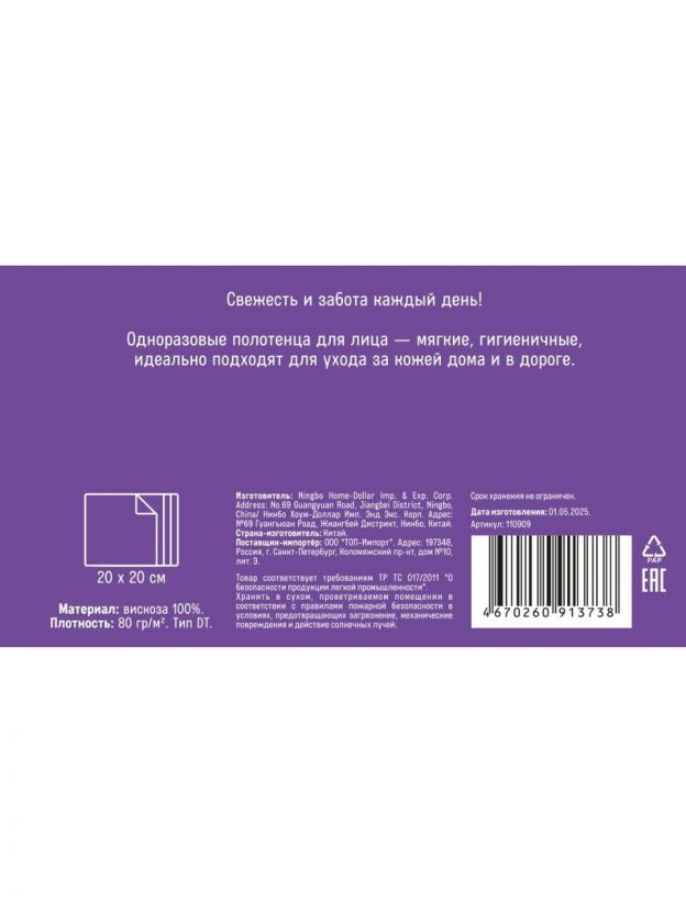 В упаковке 80 салфеток размером 20х20 см. Этого достаточно для длительного использования дома, в поездках или на даче.