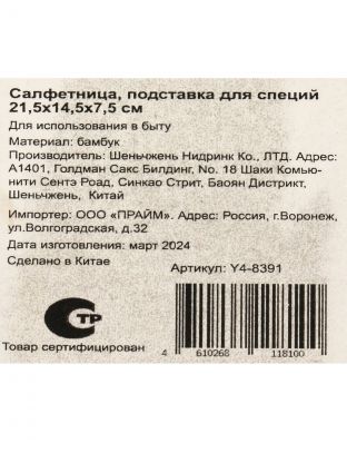Салфетница бамбук, 21.5х14.5х7.5 см, подставка для специй, Y4-8391