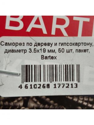 Саморез по дереву и гипсокартону, диаметр 3.5х19 мм, 50 шт, пакет, Bartex