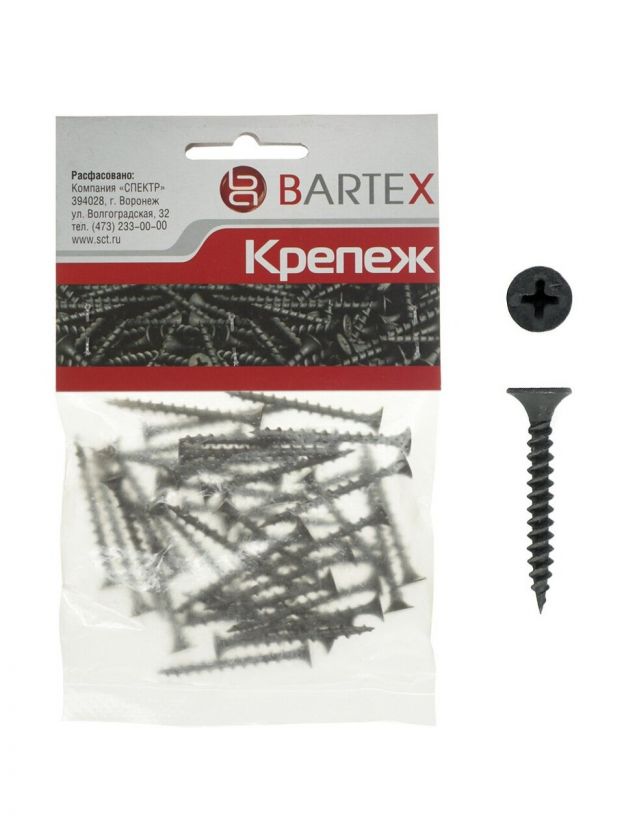 Саморезы Bartex предназначены для крепления гипсокартонных плит к металлическим каркасам. Стержень с частой резьбой обеспечивает надежное сцепление. Благодаря потайной головке изделие не выступает над поверхностью. Крестообразный шлиц позволяет проводить работу отверткой или шуруповертом. При работе с тонким металлом монтаж может производиться без сверления, в остальных случаях требуется предварительно высверлить отверстие.