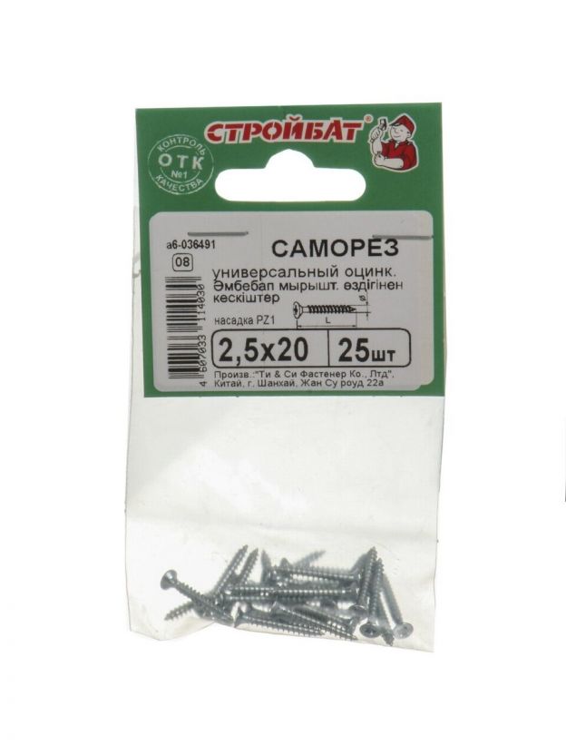 Саморез универсальный, диаметр 2.5х20 мм, 25 шт, оцинкованный, Стройбат, 36491