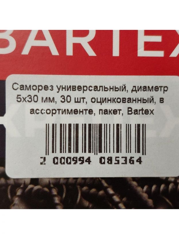 Саморез универсальный, диаметр 5х30 мм, 30 шт, оцинкованный, в ассортименте, пакет, Bartex