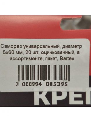 Саморез универсальный, диаметр 5х60 мм, 20 шт, оцинкованный, в ассортименте, пакет, Bartex