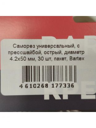 Саморез универсальный, с прессшайбой, острый, диаметр 4.2х50 мм, 30 шт, пакет, Bartex