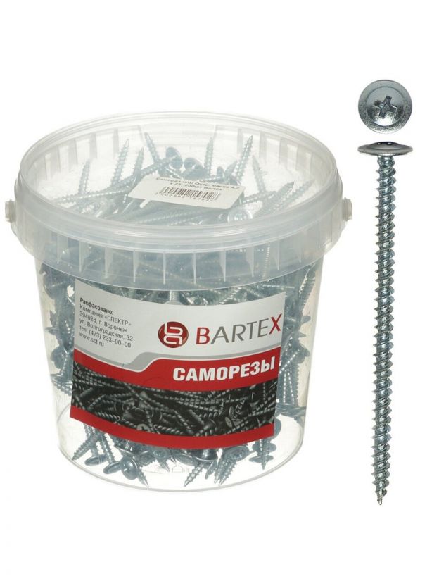 Универсальные саморезы Bartex – это незаменимые крепежные детали для проведения ремонтно-строительных работ. С их помощью Вы сможете соединить различные виды материалов: металл, древесину, пластмассу или гипсокартон. Крестообразный шлиц на головке позволяет проводить работу отверткой или шуруповертом.