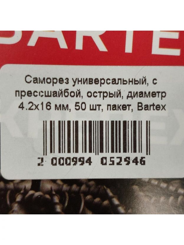 Саморез универсальный, с прессшайбой, сверло, диаметр 4.2х16 мм, 50 шт, пакет, Bartex