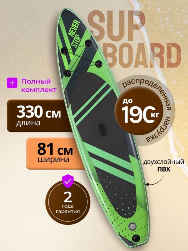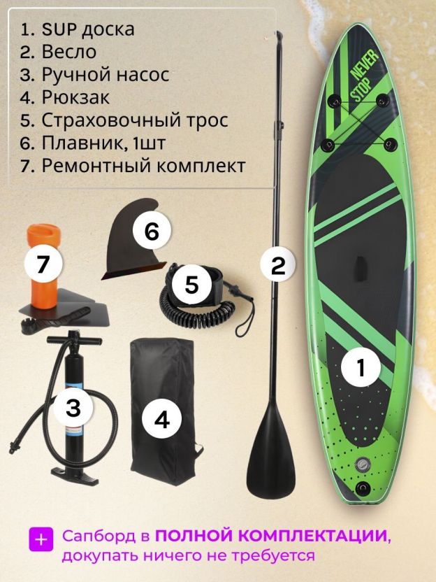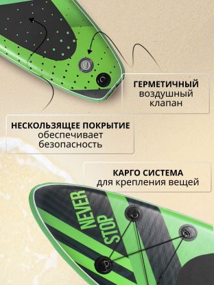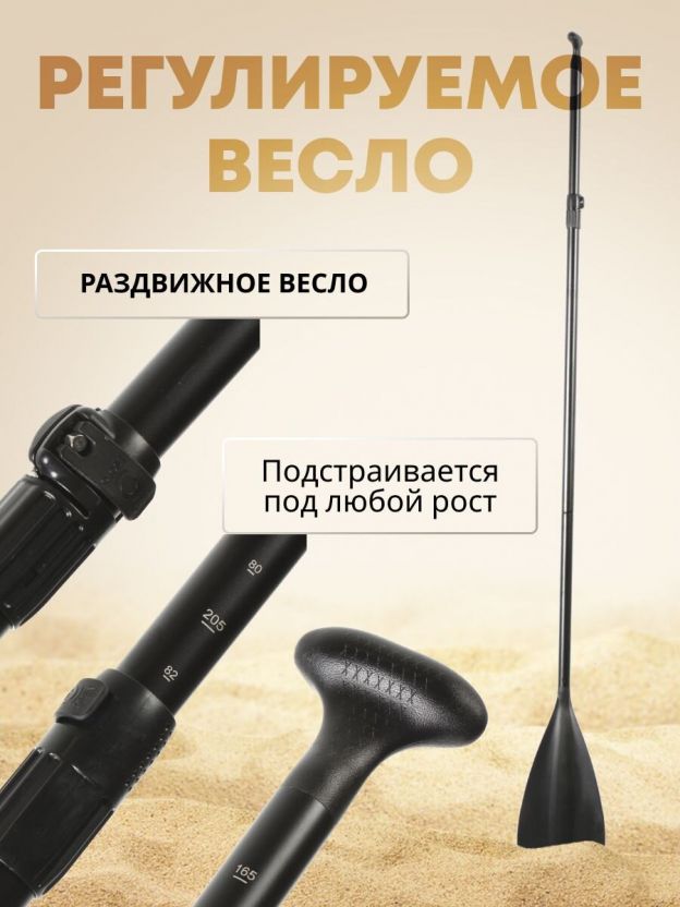 Сап борд оснащен всем необходимым для комфортного и безопасного катания: в комплект входят рюкзак для удобной транспортировки, насос для быстрого надувания, раздвижное весло, лиш для безопасности и ремкомплект на случай мелких повреждений. Максимальная нагрузка в 190 кг позволяет использовать его как для одиночных прогулок, так и для катания вдвоем с ребенком или питомцем.