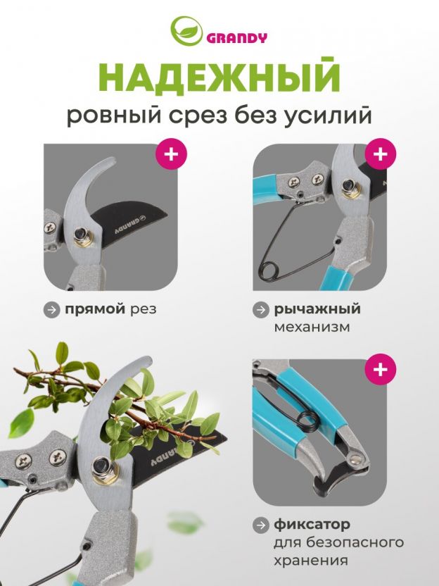 • Контактный секатор Grandy с фиксатором — чистый срез без повреждения растений;