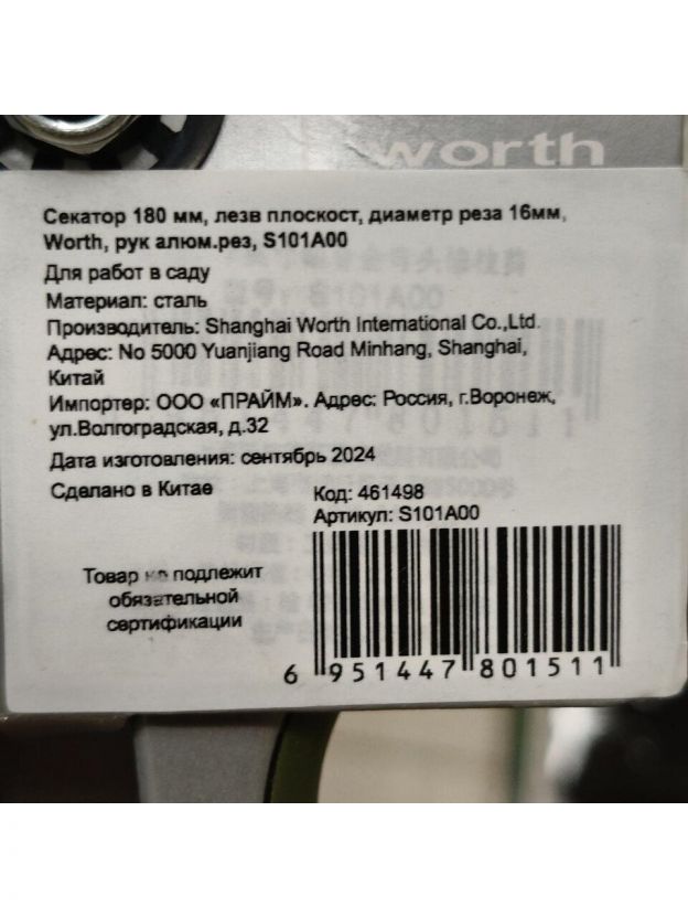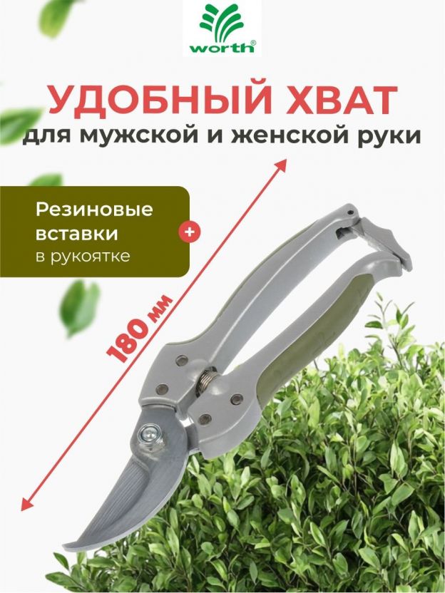 Секатор 180 мм, диаметр реза 16 мм, лезвие плоскостное, с наковальней, Worth, алюминий, резина, S101A00