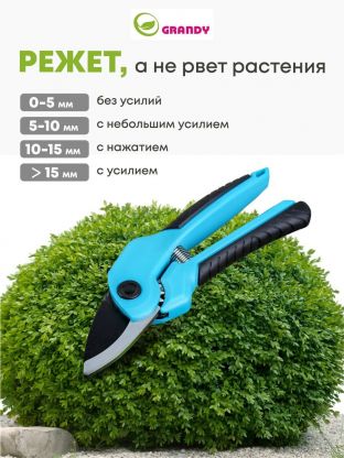 Секатор Grandy рассчитан на резку веток диаметром до 20 мм благодаря прочному стальному лезвию и системе с наковальней.